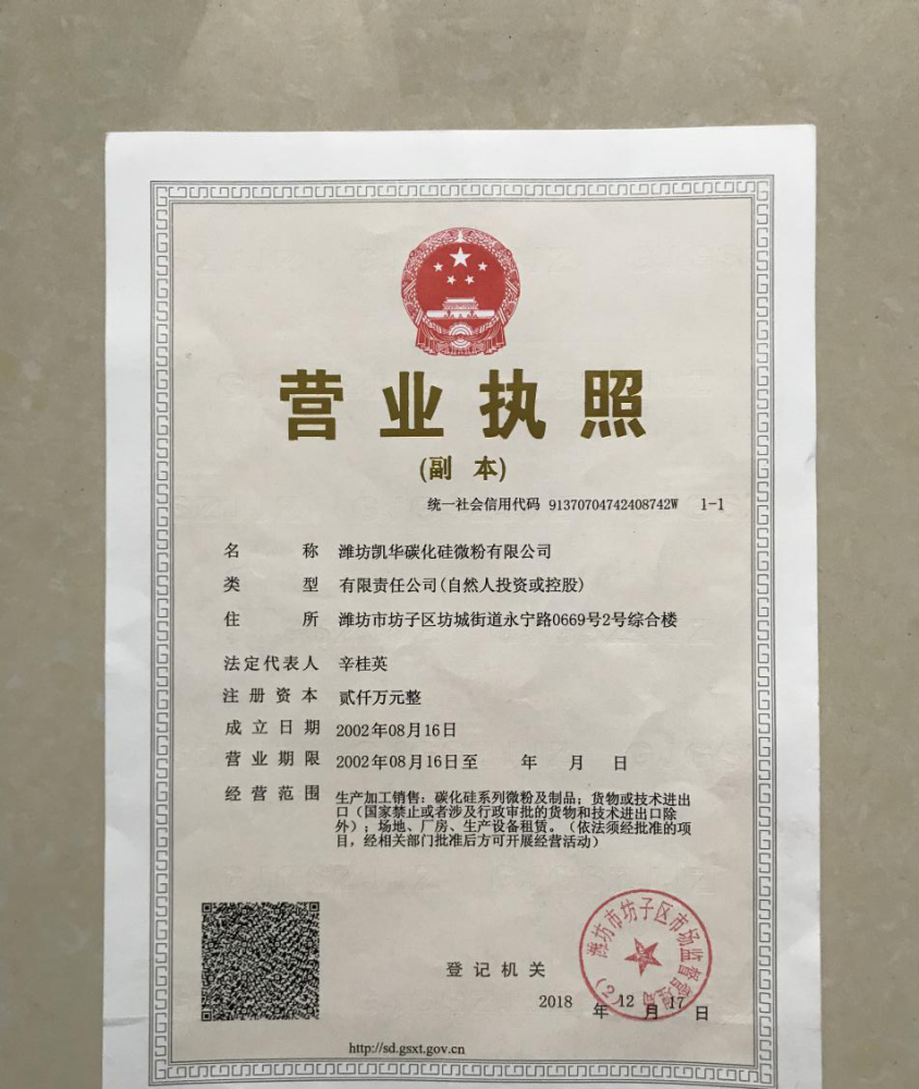 濰坊凱華碳化硅微粉有限公司成立于2002年,國家高新技術(shù)企業(yè),公司占地40畝,標(biāo)準(zhǔn)廠房19000平方,辦公樓、研發(fā)處2000平方,年生產(chǎn)能力3萬噸。一直從事陶瓷級(jí)微粉的生產(chǎn)銷售,所生產(chǎn)的超細(xì)碳化硅微粉具有純度高、粒形好、穩(wěn)定性強(qiáng)等特點(diǎn),主要用于反應(yīng)燒結(jié)、無壓燒結(jié)、硅碳棒新工藝、重結(jié)晶燒結(jié)、蜂窩陶瓷、機(jī)車制動(dòng)裝置、研磨拋光、金屬防腐表面噴涂、納米隔熱保溫材料等領(lǐng)域。標(biāo)準(zhǔn)產(chǎn)品有:F240、F1200、W40、W28、W20、W14、W10、W7、W5、W3.5、 W2.5、W2、W1.5、W0.5、5S、D3E、100F、RS07、RS100及整形高密度系列綠碳化硅微粉......